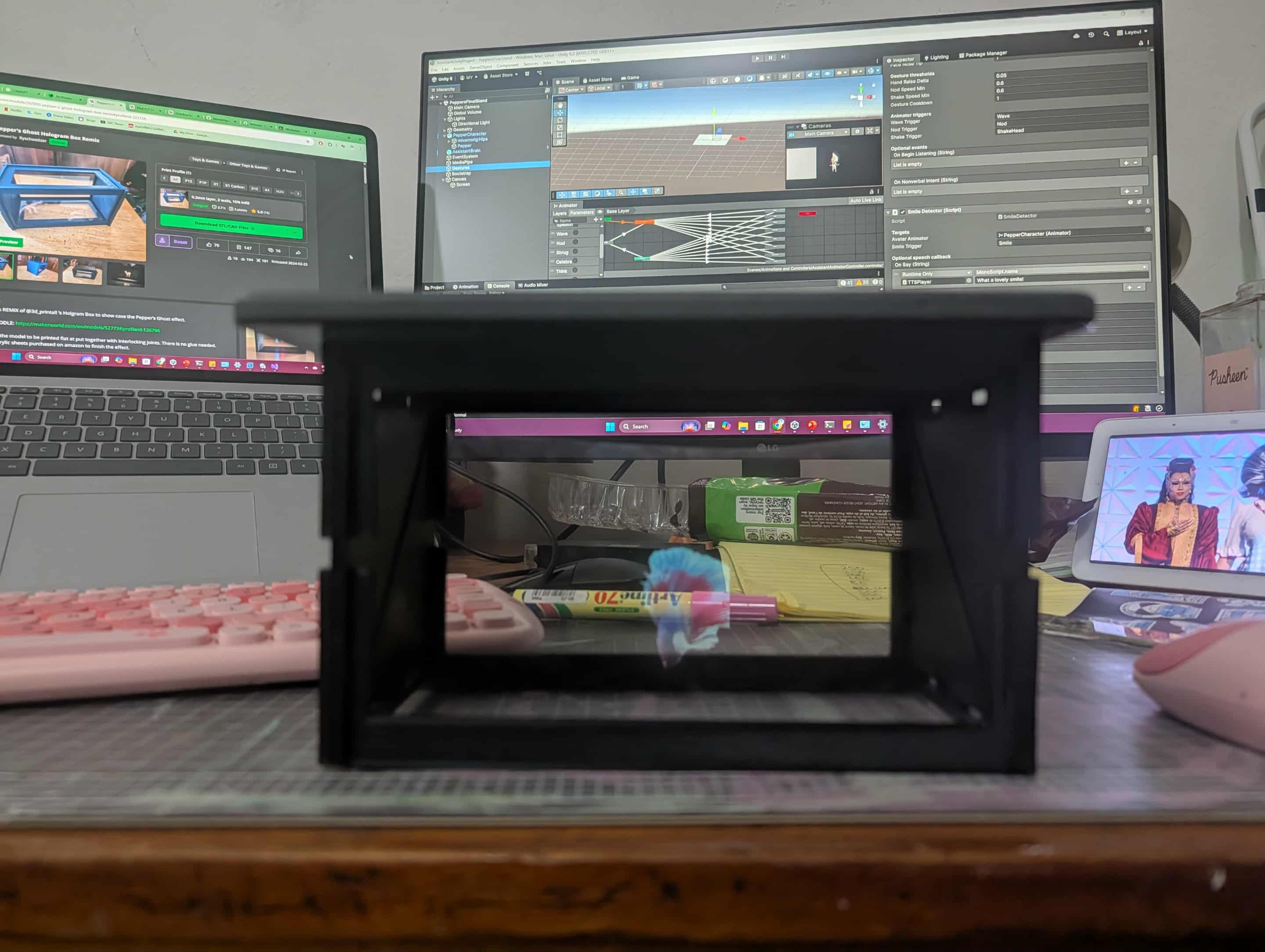 The concept for Pepper as a character emerged when researching different possibile presentation methods for an interactive assistant. I was particularly taken with the idea of a holographic assistant. Much existing 3D holographic technology, while beautiful to look at can be prohibitively expensive. For example, Voxon Photonics VX1 which physically builds holograms using millions of points of light (4), costs $11,700 USD plus shipping (5). This takes it well out of the price point of the average person. One way around this is using the Pepper’s Ghost holographic illusion. Originally patented in 1863 by John Henry Pepper and Henry Dircks, it was invented to create a ghost like illusion projection onto the stage (6). Today, artists like Joshua Ellingson can recreate this holographic effect using the same principles as the 1863 patent with just their phones and the top of their iced coffee lid (7).