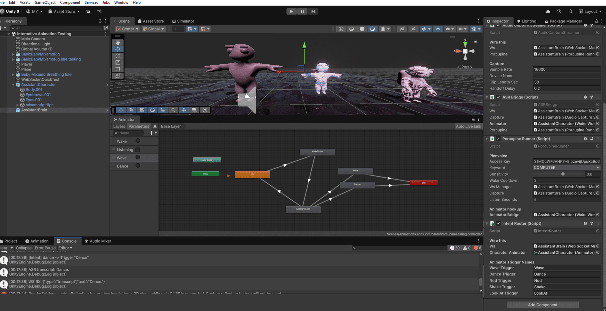 Local WebSocket pipeline for Porcupine wake word → Whisper transcription → TTS response